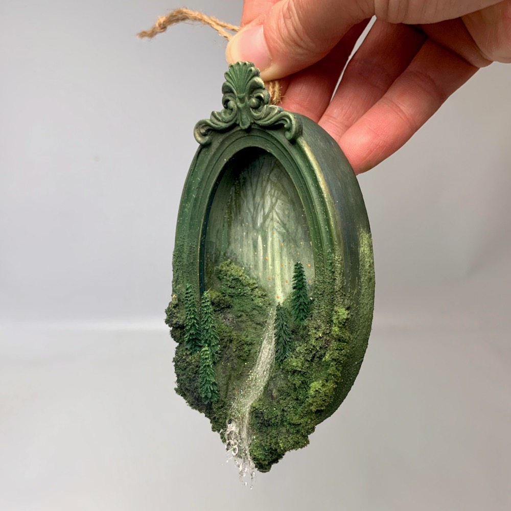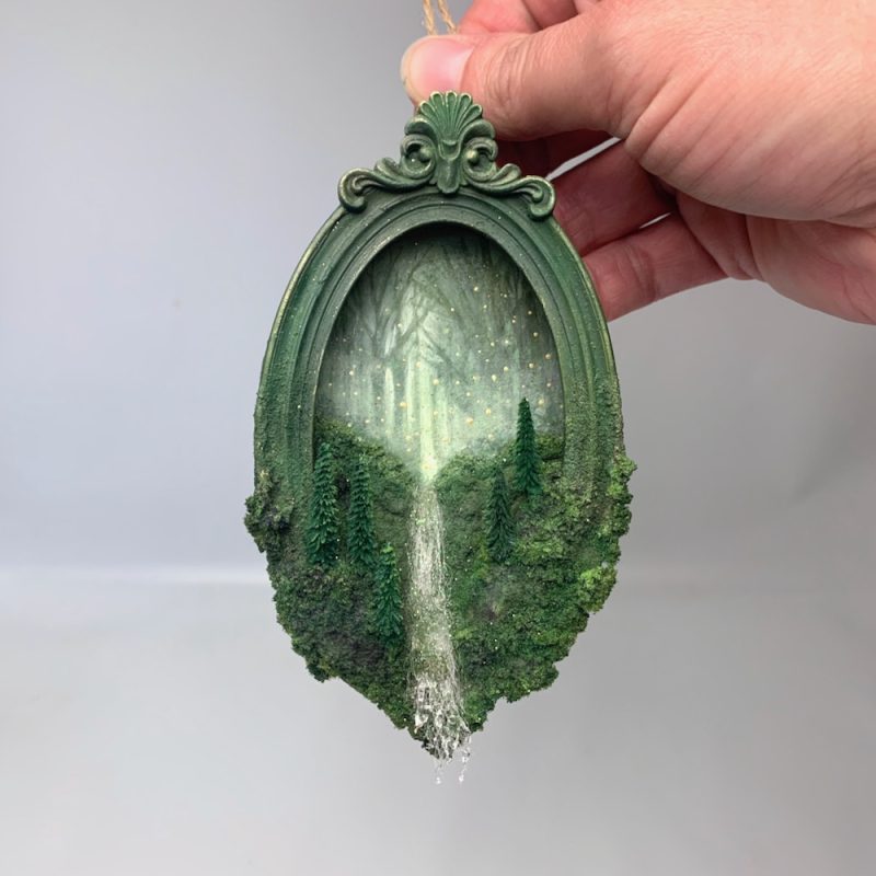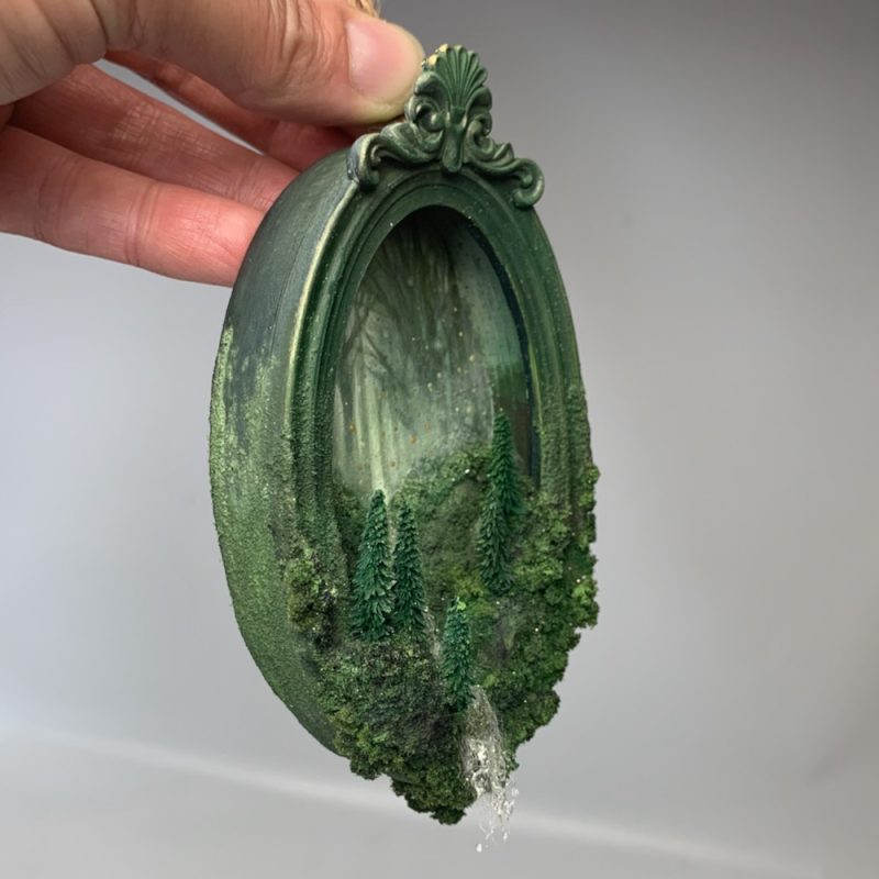 A tiny portal to another world. This miniature frame has been hand made and painted and filled with a lush mossy forest. A sparkling waterfall runs through the centre and gushes over the edge.
