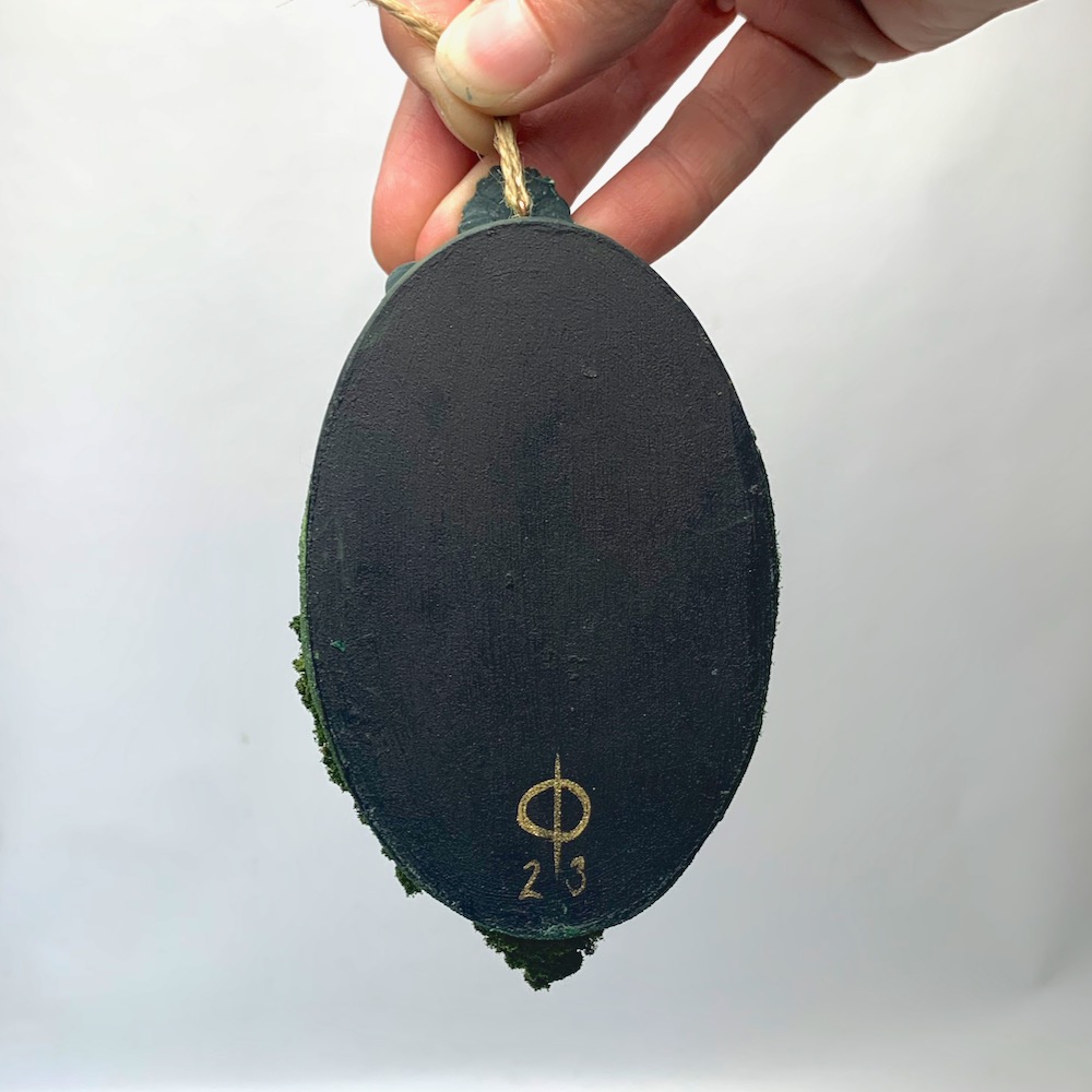 It measures 7cm wide x 13cm tall x 3cm deep and is fixed with a hanging loop for display.