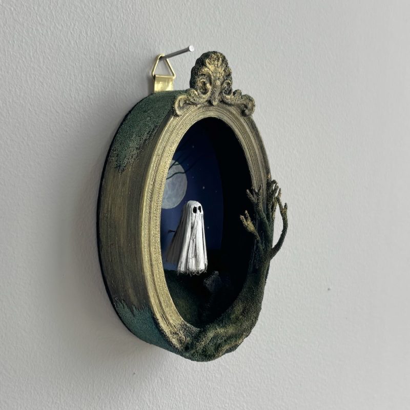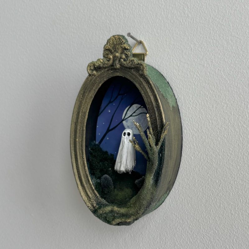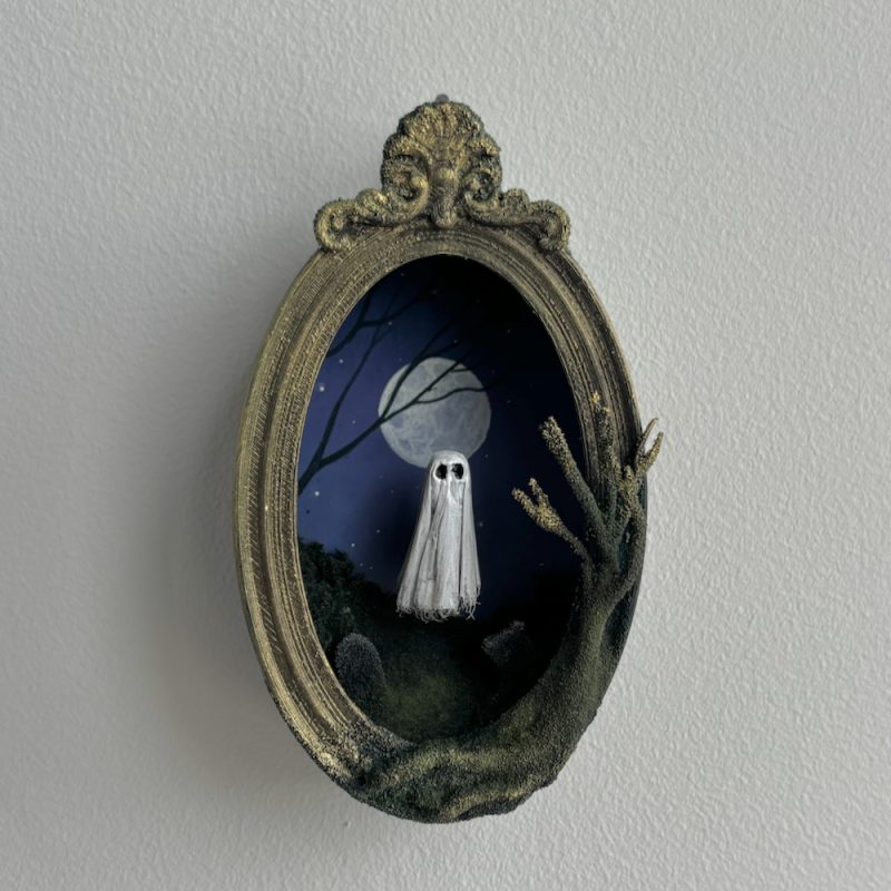 This spooky little ghost floats in an ornate frame filled with a graveyard scene.