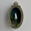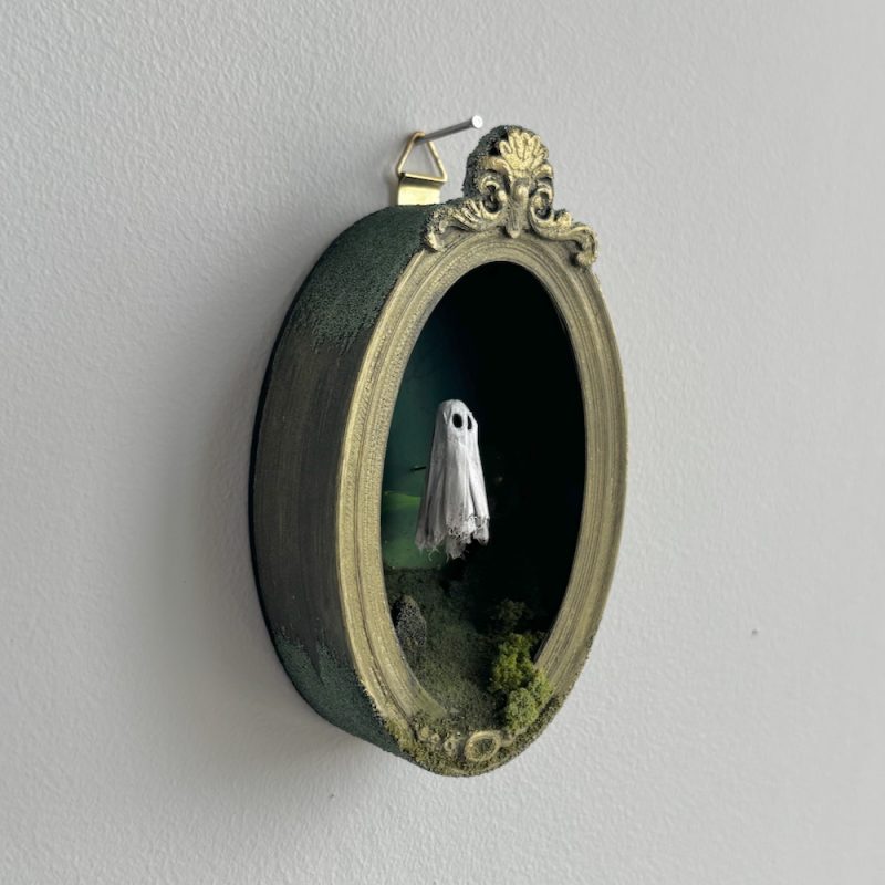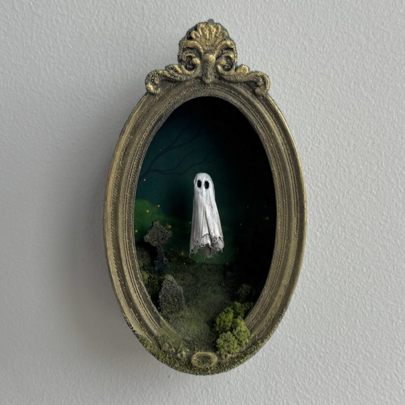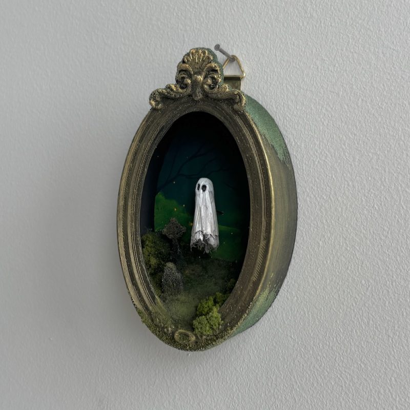 This spooky little ghost floats in an ornate frame filled with a graveyard scene.