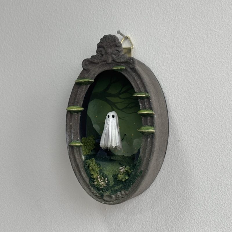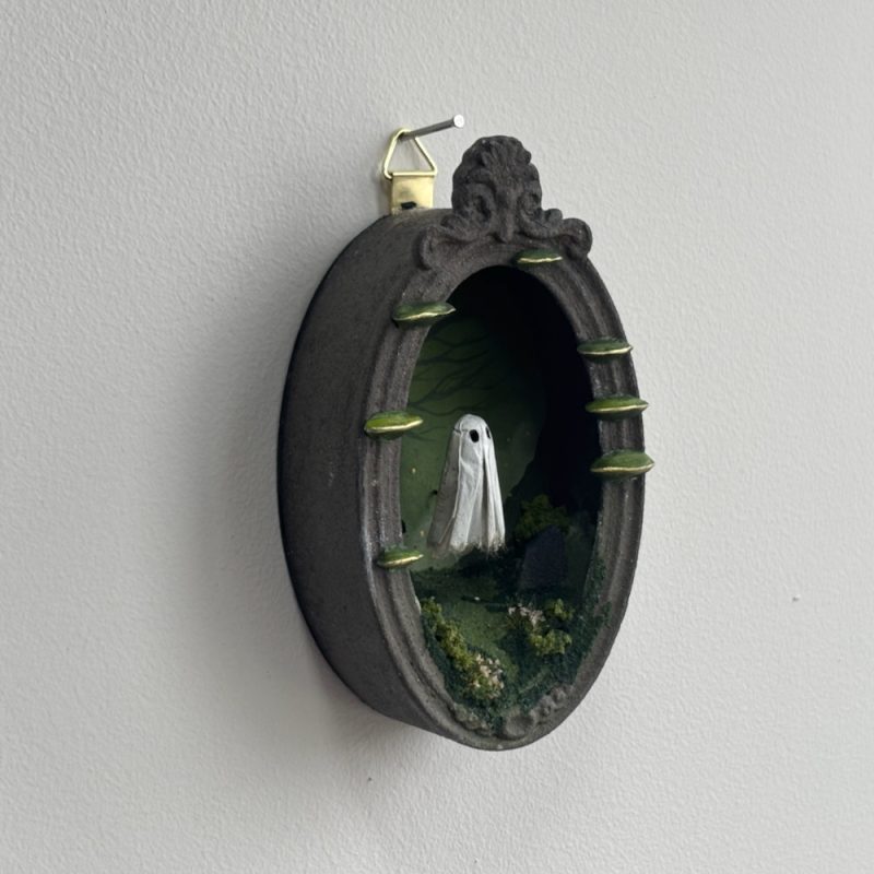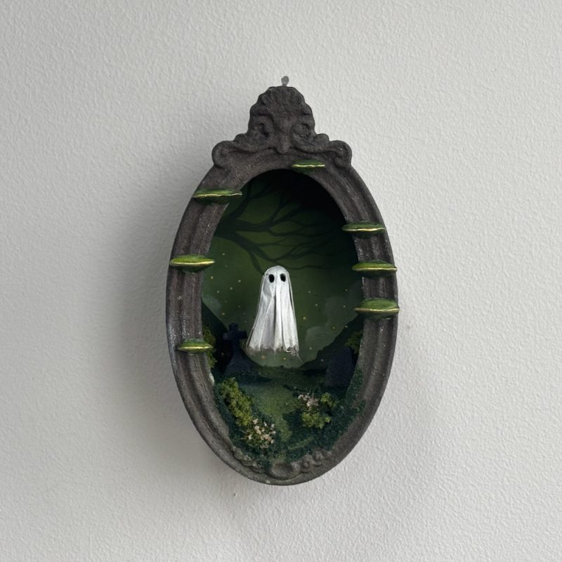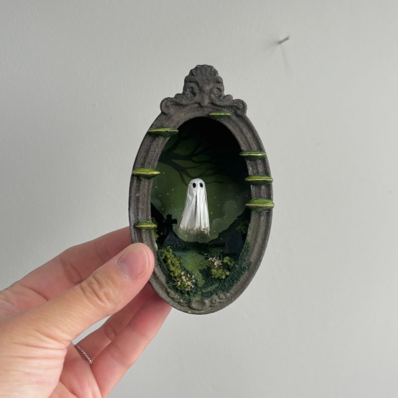 This spooky little ghost floats in an ornate frame filled with a graveyard scene.