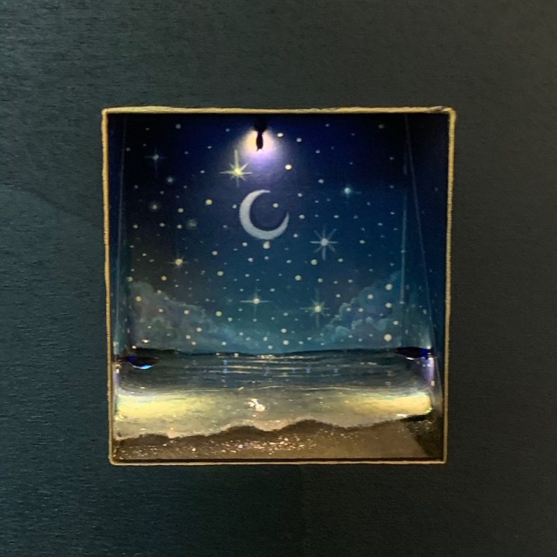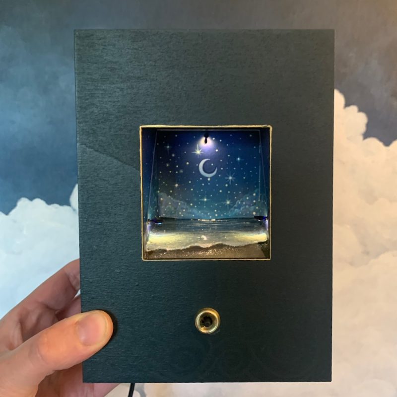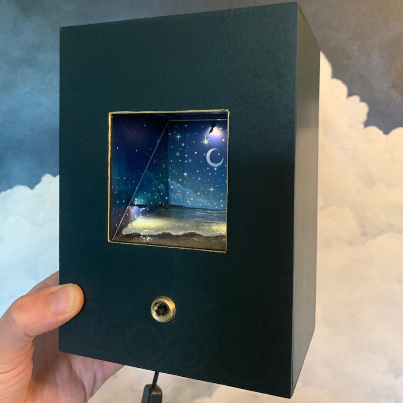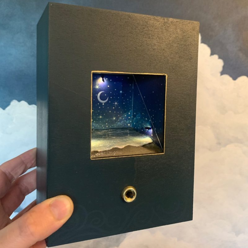 This little wooden box contains a diorama of sparkling waves rolling on to the edge of a sandy beach. Press the button to see stars fall from the sky in to the water below.