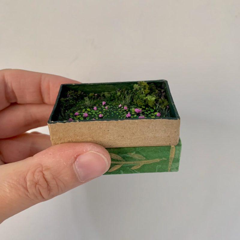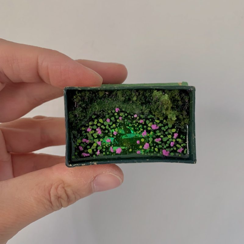 A tiny lily pond diorama contained in a papier mache matchbox.