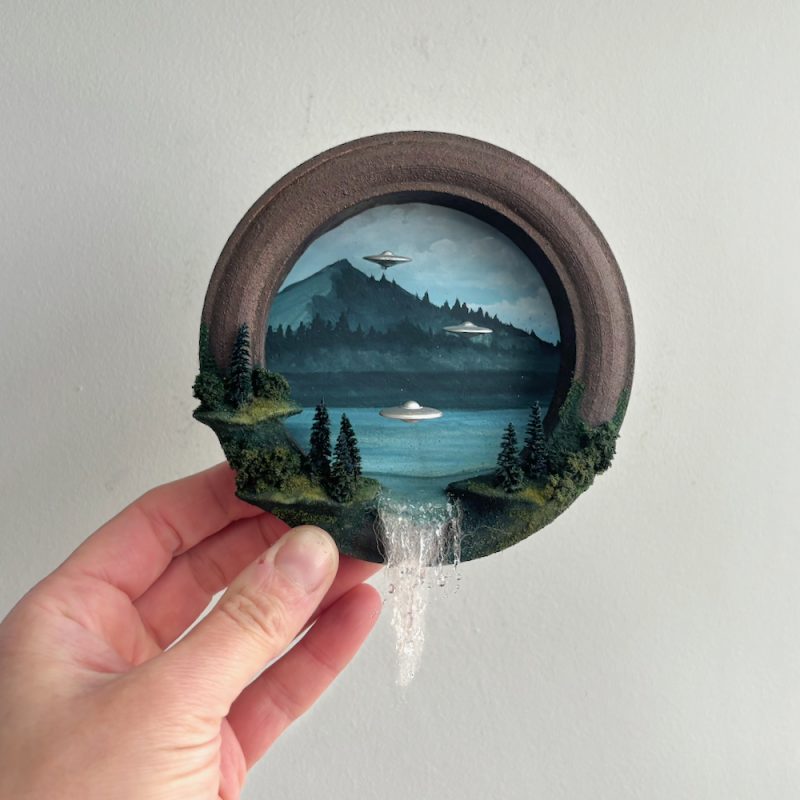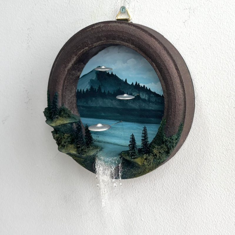 A tiny portal to another world. This frame has been hand made and painted with a lake scene edged with pine trees. Three silver UFO’s hover above the sparkling water.