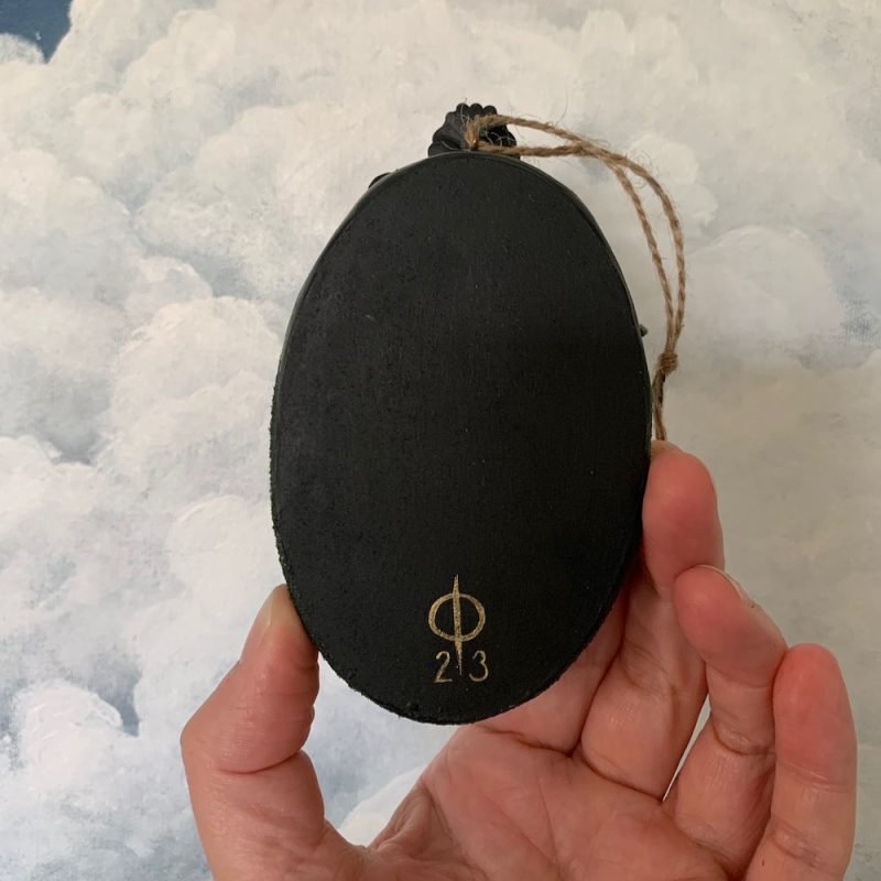 It measures 7cm wide x 13cm tall x 3cm deep and is fixed with a hanging loop for display.