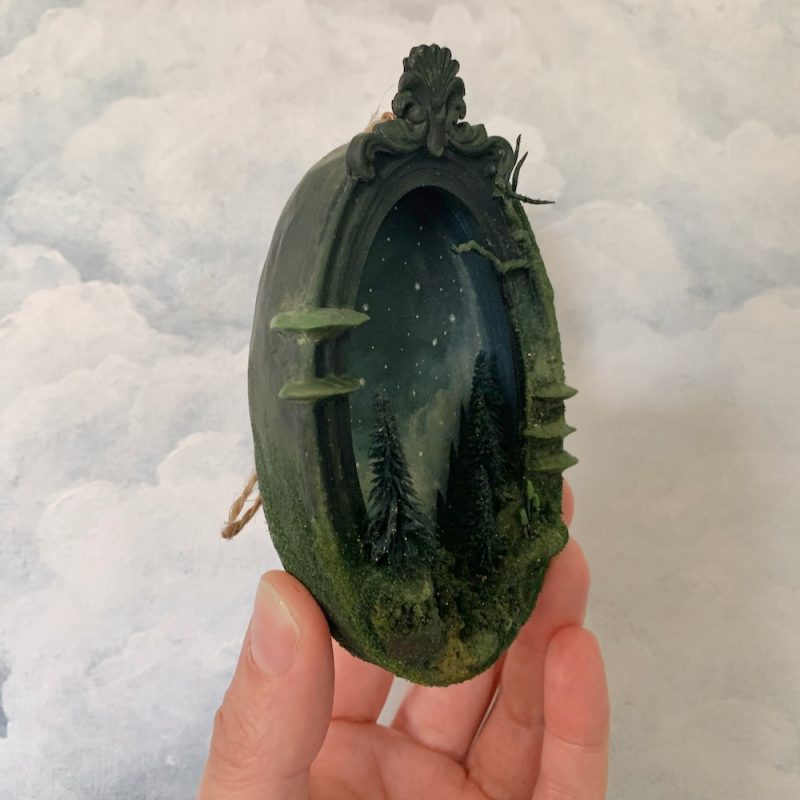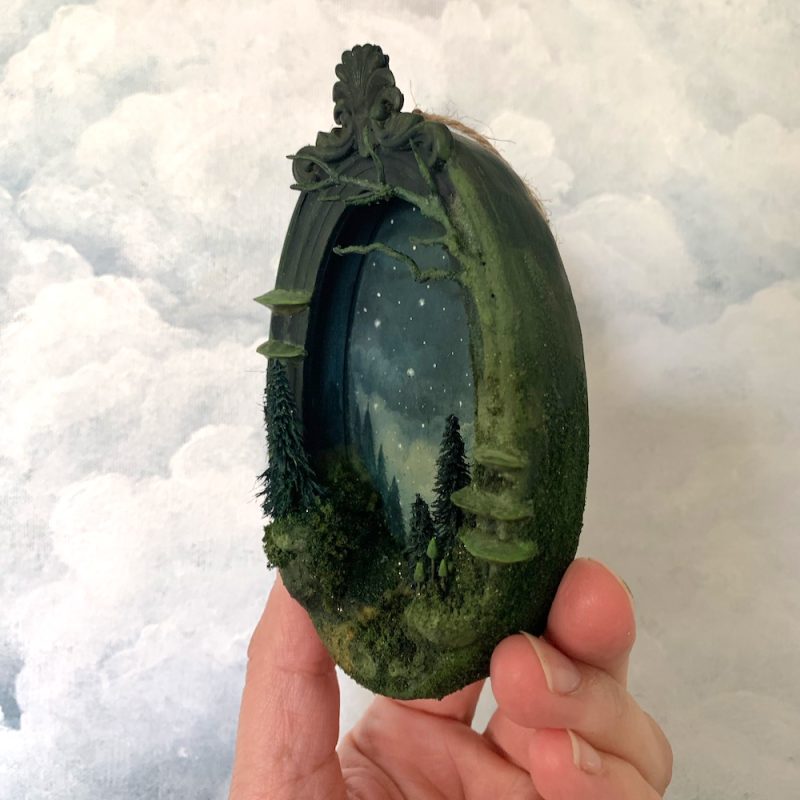 A tiny portal to another world. This miniature frame has been hand made, painted and filled with a green mossy pine forest with mushrooms, fungi and twisted branches surrounding the exterior. A path runs through the centre of the scene to a standing stone on a hill beneath a starry sky.