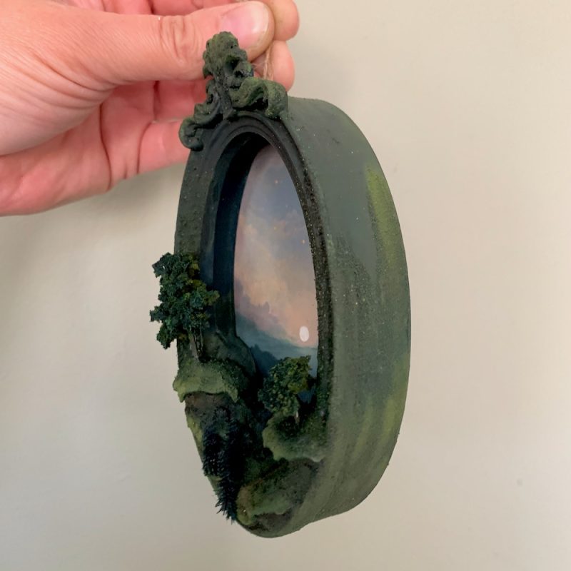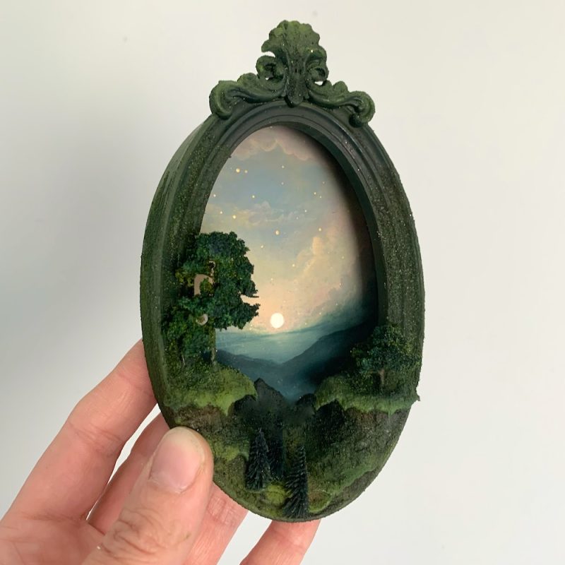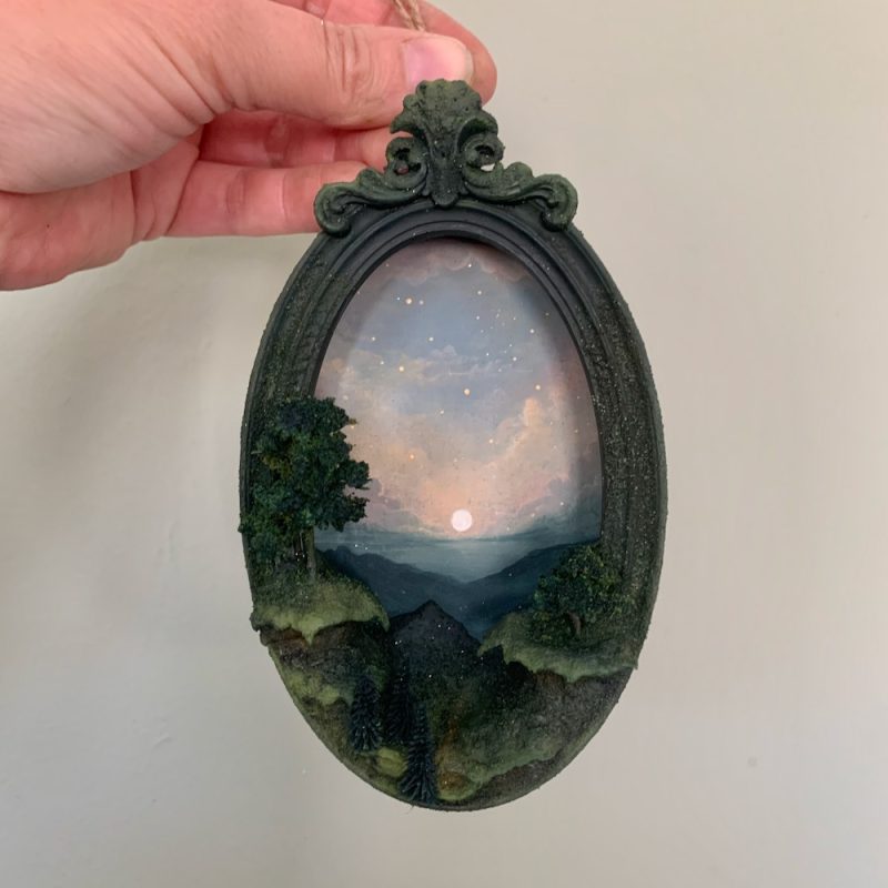 A tiny portal to another world. This miniature frame has been hand made, painted and filled with rolling dark green hills beneath a beautiful sunset. Trees stand on mossy crags on either side and the sky is filled with clouds and golden stars.