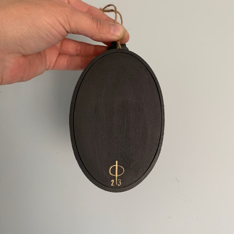It measures 9cm wide x 15cm tall x 3cm deep and is fixed with a hanging loop for display.
