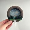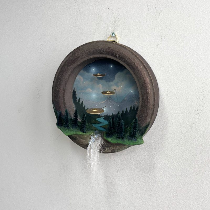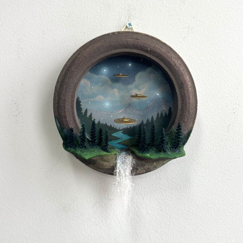 A tiny portal to another world. This frame has been hand made and painted with a winding river running through a forest valley and spilling from the edge of the frame. Three golden UFO’s hover over the sparkling water.