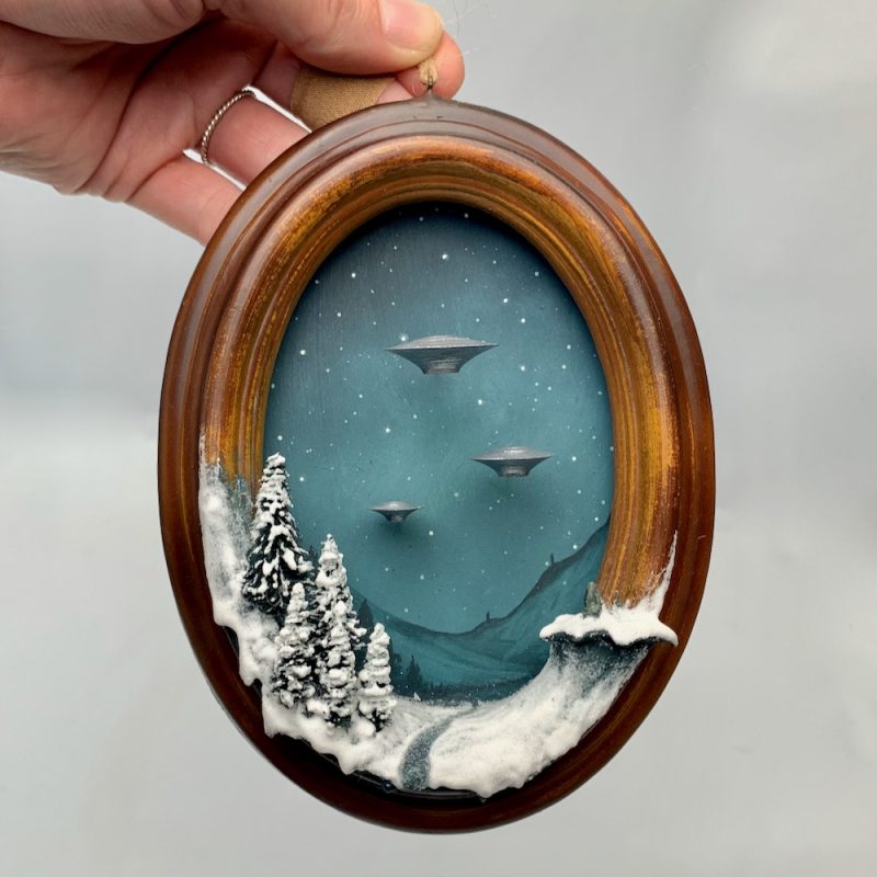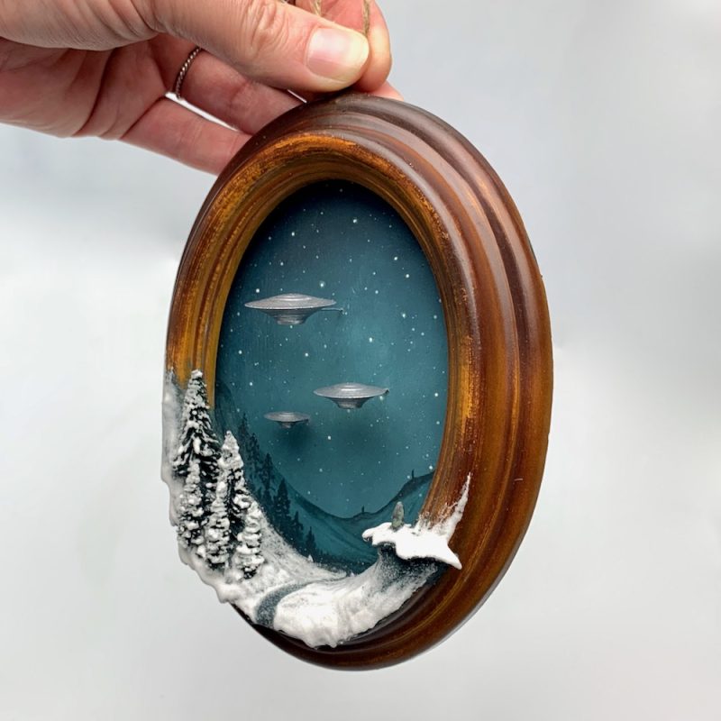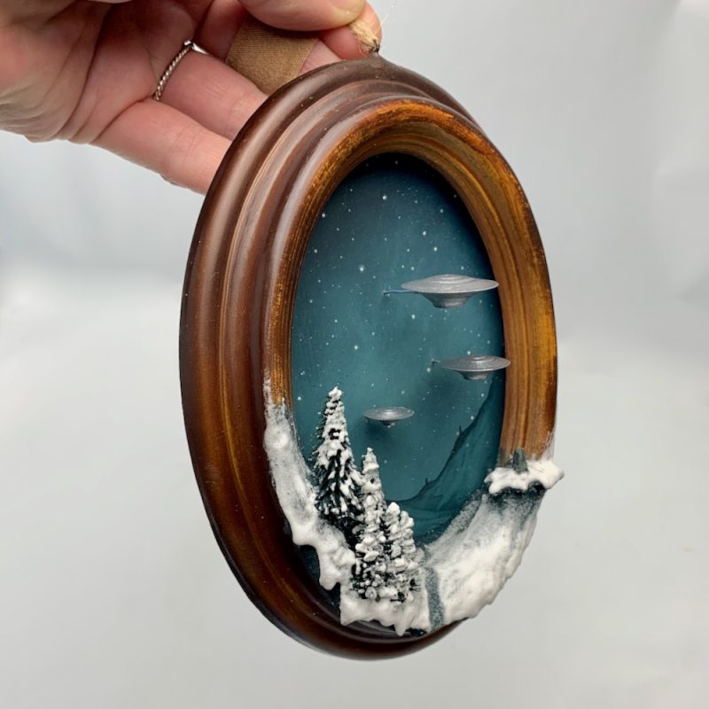 A tiny portal to another world. This wood effect miniature frame has been painted and filled with snow covered pines opposite a standing stone on a hill. Three Unidentified Flying Objects hover silently above.
